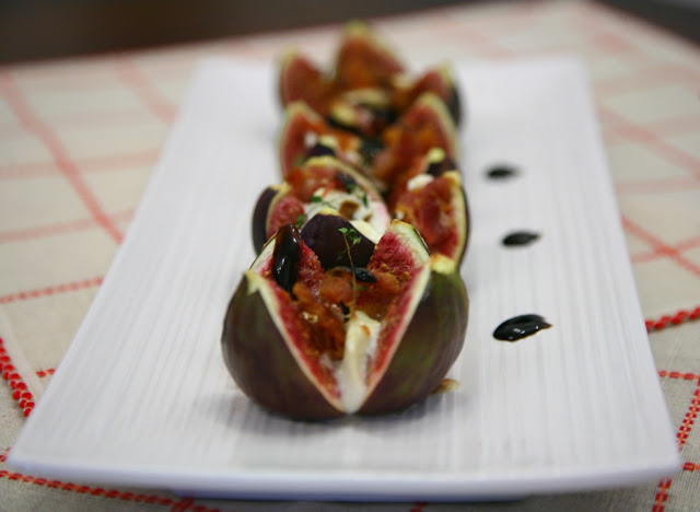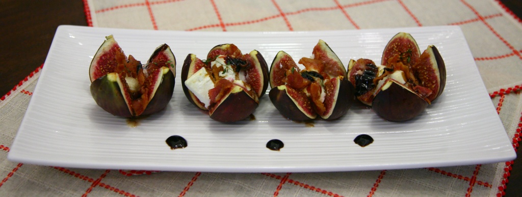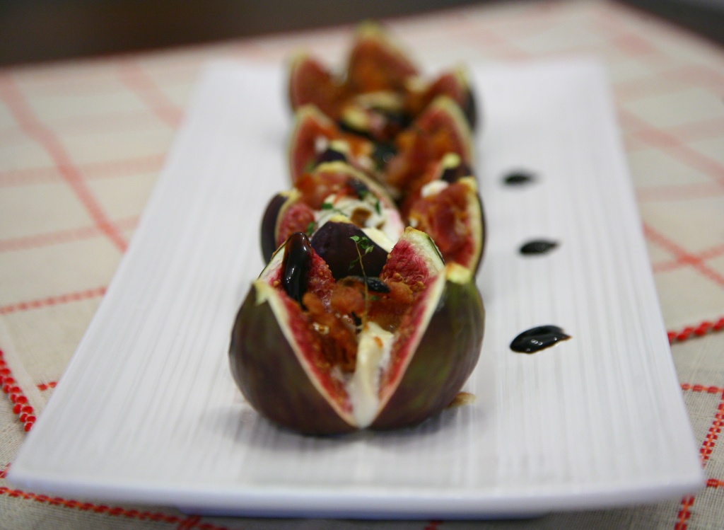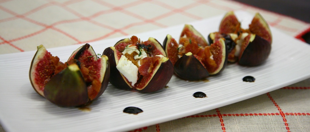 Inserire all’interno di ogni fico dei pezzetti di robiola di capra e delle briciole di bacon, un rametto di timo e completare con due gocce di glassa di balsamico.