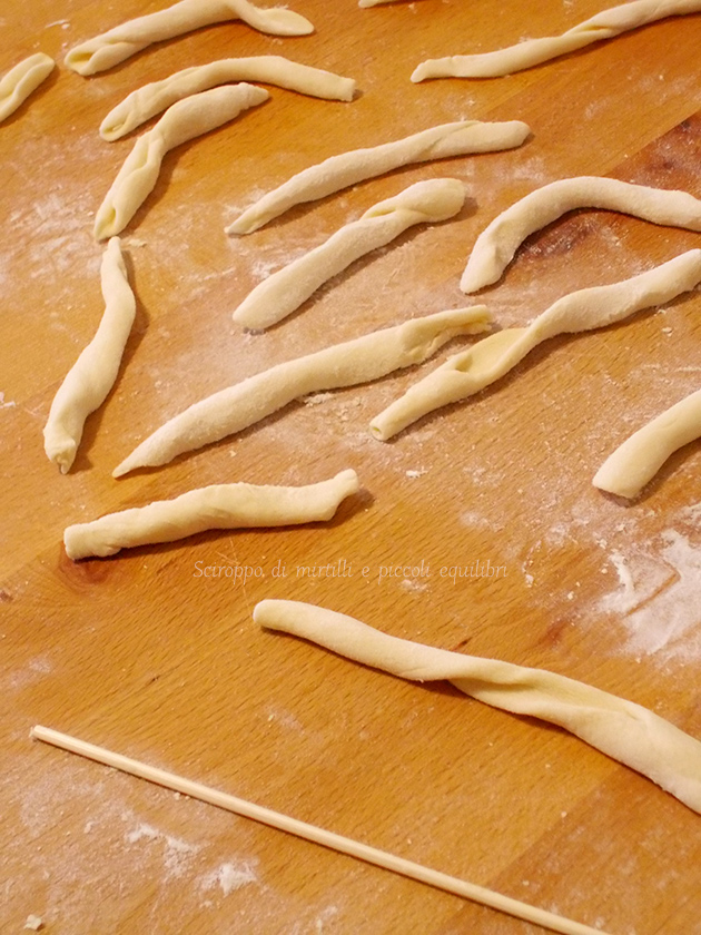 Si passa il bastoncino in legno su ciascun cordoncino, si fa una leggere pressione con il palmo delle mani e si fa ruotare sulla spianatoia e si sfila. Via via si lavora con il resto dell’impasto.