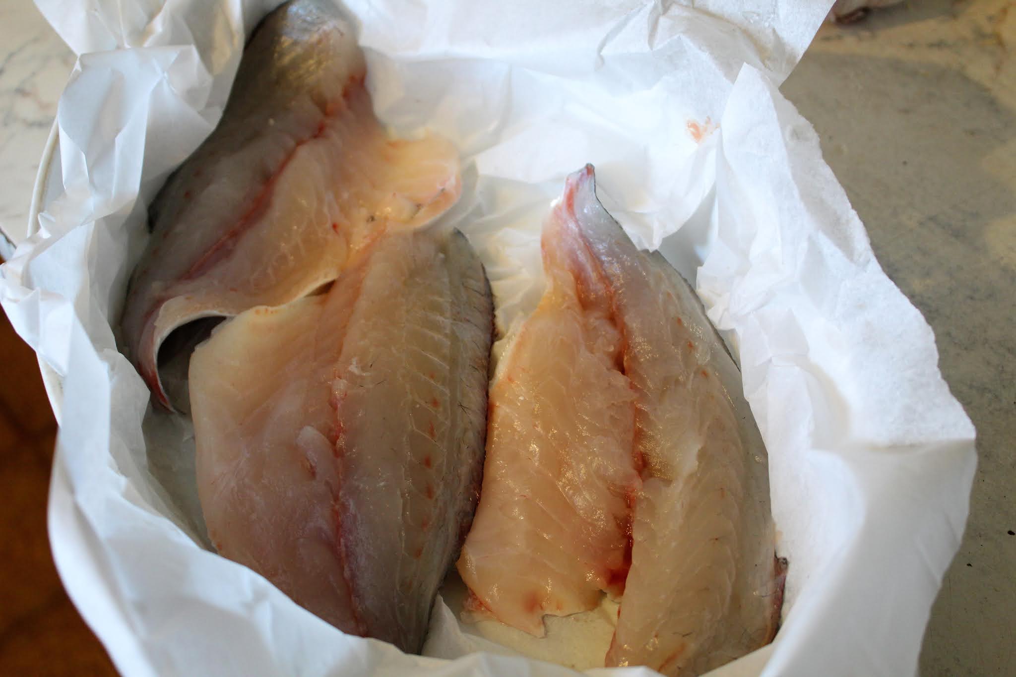 Rivestire una pirofila con la carta forno e adagiarvi il pesce con il lato della pelle rivolto verso il basso: