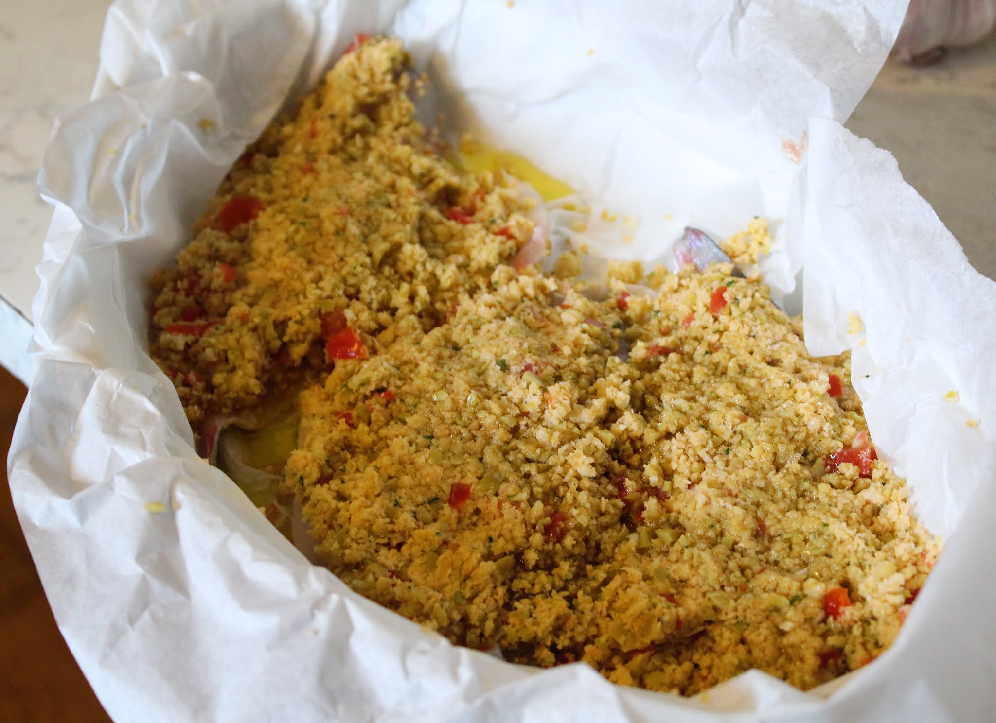 Preparazione: per la panure, spezzare il pane a piccoli pezzi e frullarlo con l’aglio, i pomodorini, le olive, l’origano, il sale e il pepe.
