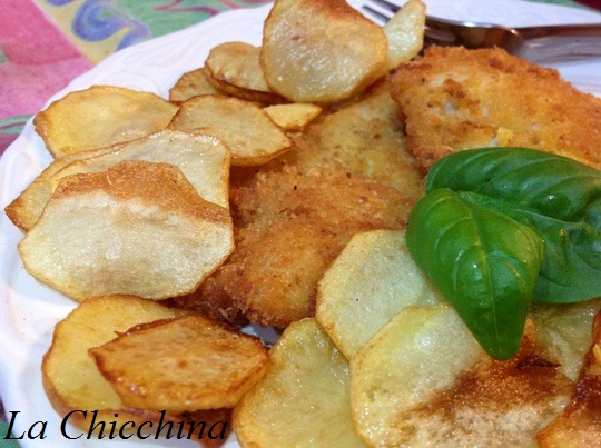 Sbucciare le patate, tagliarle a fettine molto sottili, tamponarle con la carta da cucina e friggerle poche alla volta nell’olio caldo.