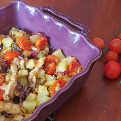 Insieme alla carne unite: i pomodorini tagliati a metà, le erbe aromatiche, le olive, un filo di olio, E.V.O. date una bella rigirata, quindi rimettete in forno fino a cottura ultimata, ci vorranno circa 35 minuti.