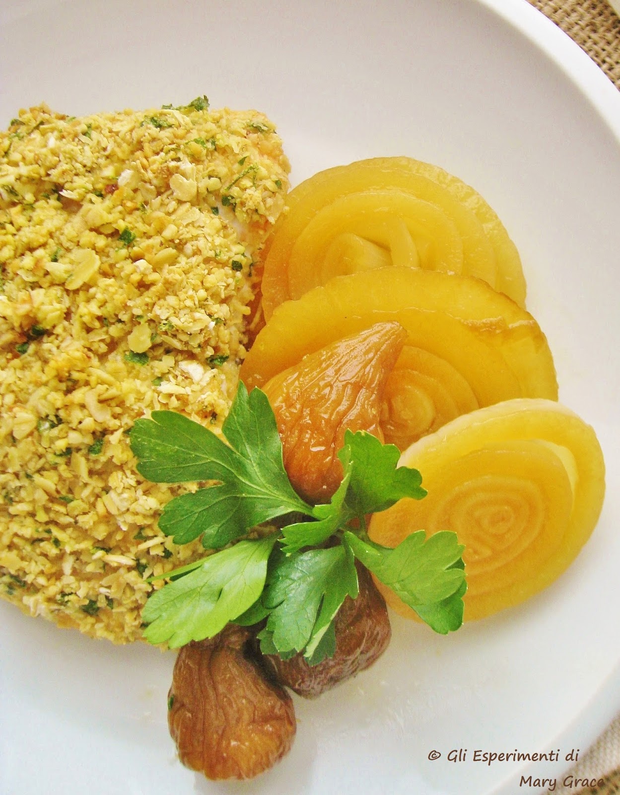 Protagonista di questo piatto è il salmone (ma potete scegliere il pesce che più gradite), avvolto da una panatura che adoro, preparata con nocciole e fiocchi d’avena ed accompagnato da un contorno dalla connotazione forse autunnale, ma semplicemente irresistibile.