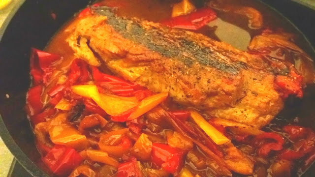 unire i peperoni lavati e tagliati a filetti,la cipolla affettata sottile,i pomodorini( privi di semi),