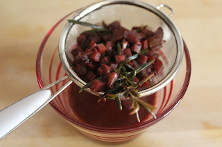 Filtrare il liquido, tenendo da parte il rametto di rosmarino e scartando il trito.
