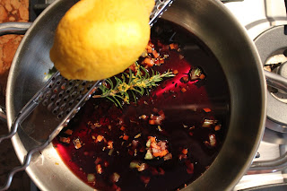 Per aromatizzare il vino, in una casseruola unire il trito di sedano, carota e cipolla, 1 cucchiaio di olio, il vino rosso. la buccia di limone grattugiata e il rosmarino. Portare ad ebollizione e cuocere per per 3-4 minuti.