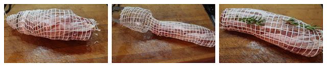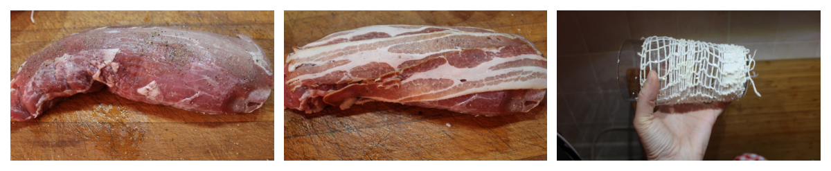 Ora inserite il filetto all’interno della pinta, fate scorrere la rete sulla carne ed estraete la carne via dal bicchiere, più facile a farsi che a dirsi. Tagliate via l’eccedenza della rete è il gioco è fatto, infilate infine il rosmarino nelle maglie elastiche.
