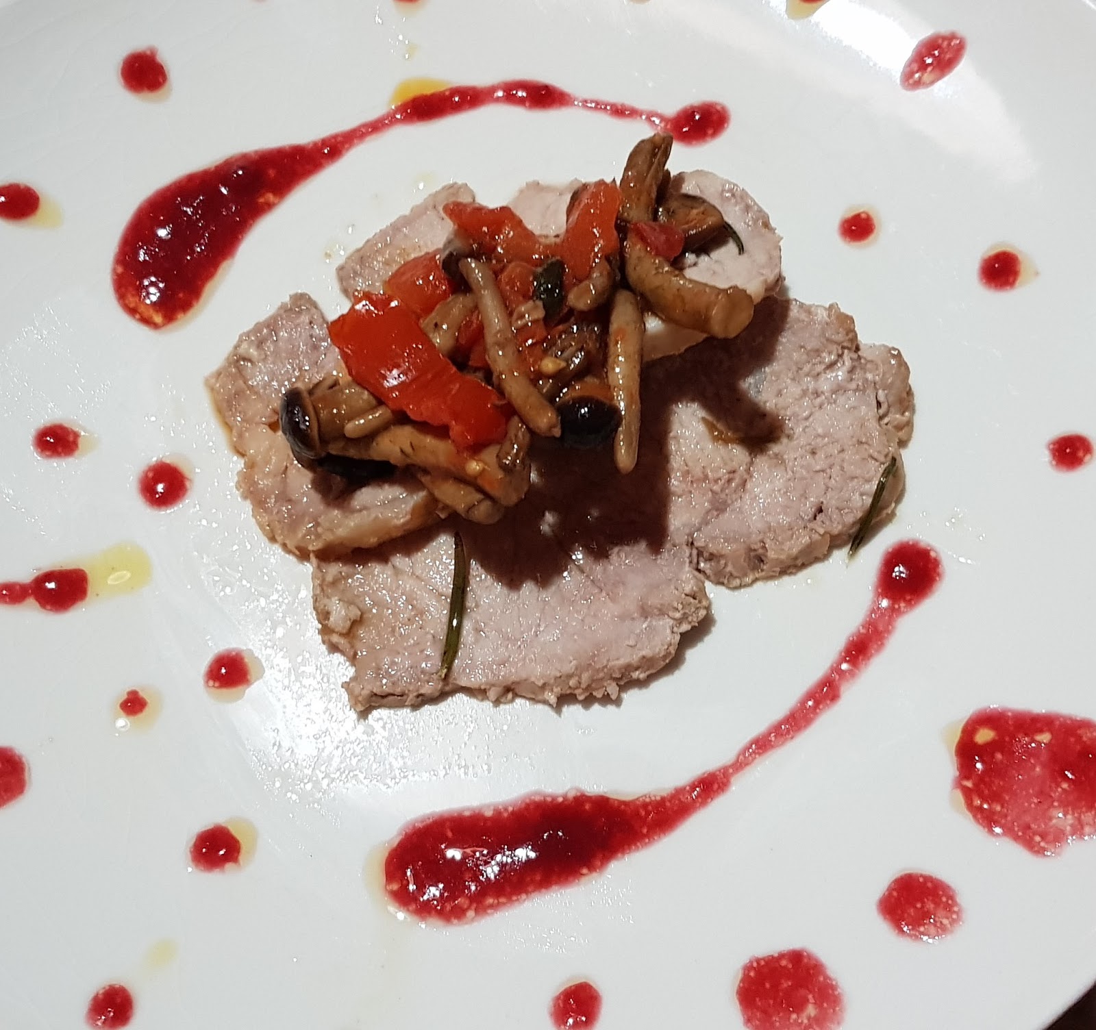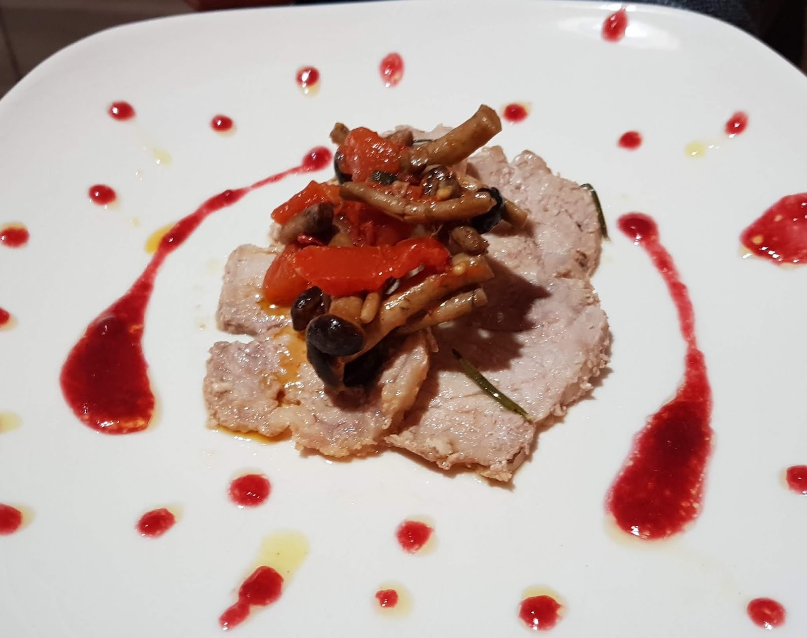 6) Tagliare il filetto a fettine sottili ed impiattare come da foto aggiungendo un po’ del sugo di cottura del filetto, la salsa al ribes ed i funghi