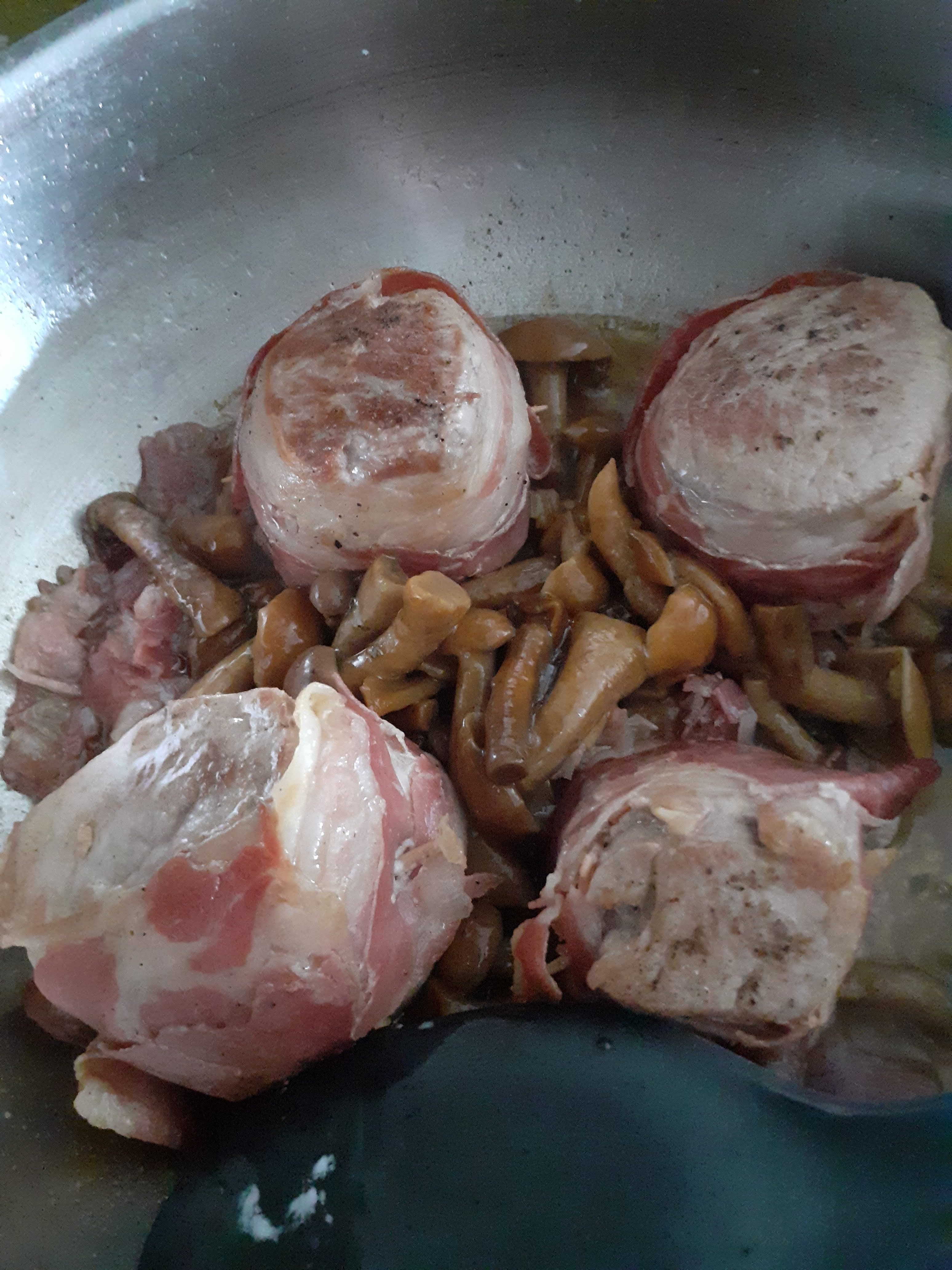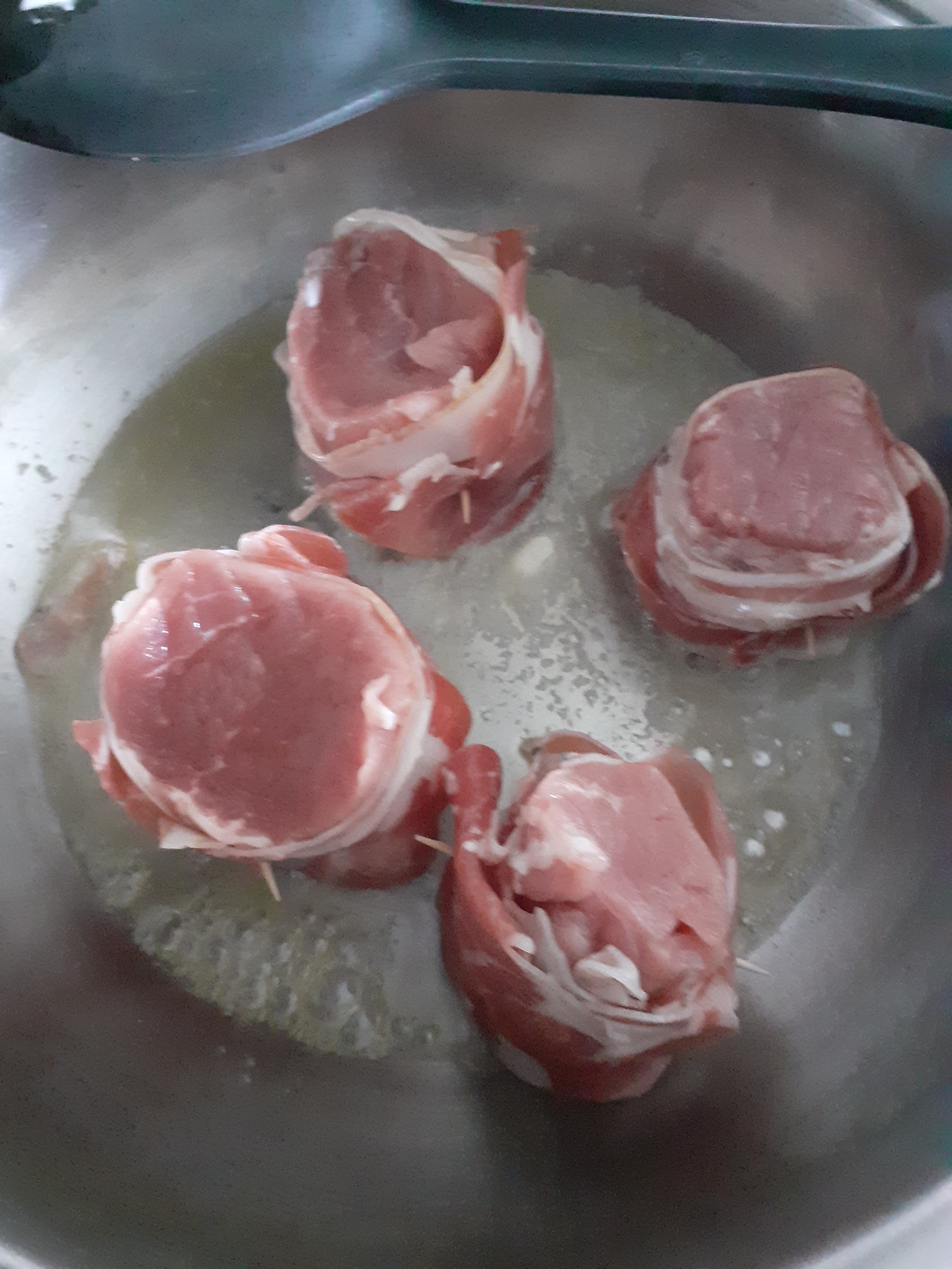 le avvolgiamo con le fette di pancetta (2 x parte) e le leghiamo con uno stuzzicadenti