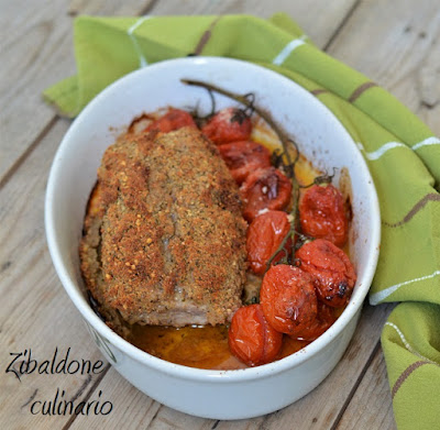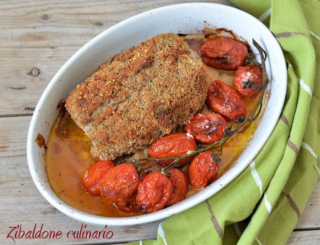 Trasferirlo in una teglia da forno leggermente unta, contornarlo di pomodorini interi conditi con olio e sale.