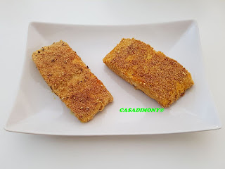 Ho messo in un piatto l’amaranto e lo zafferano che ho utilizzato ad impanare il salmone, poi ho messo un goccio di olio in una padella ed ho fatto cuocere il salmone per un paio di minuti per lato