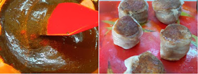 Appena il cioccolato si sarà completamente fuso, aggiungiamo il peperoncino ed il burro ed amalgamiamo per bene. Togliamo i filetti dalla padella, liberiamo dallo spago quindi avvolgiamoli nelle fette di lardo che, col calore residuo, aderirà perfettamente al maiale.