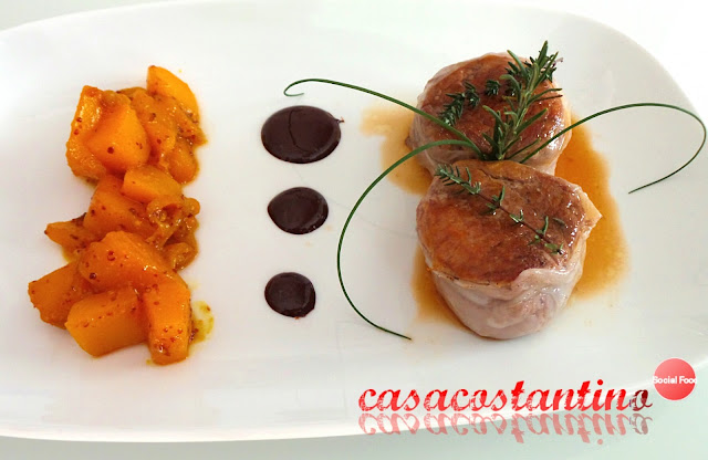 Il piatto ideale per presentare questa portata, è un piatto rettangolare. Disponiamo, da un lato del piatto, una striscia di chutney, dall’altro due medaglioni di filetto ed al centro tre gocce, di dimensioni diverse, di salsa di cioccolato. Irroriamo il maiale con i succhi di cottura e decoriamo con dei fili di erba cipollina, due rametti di timo fresco ed un rametto di rosmarino incastrati tra i due filetti.