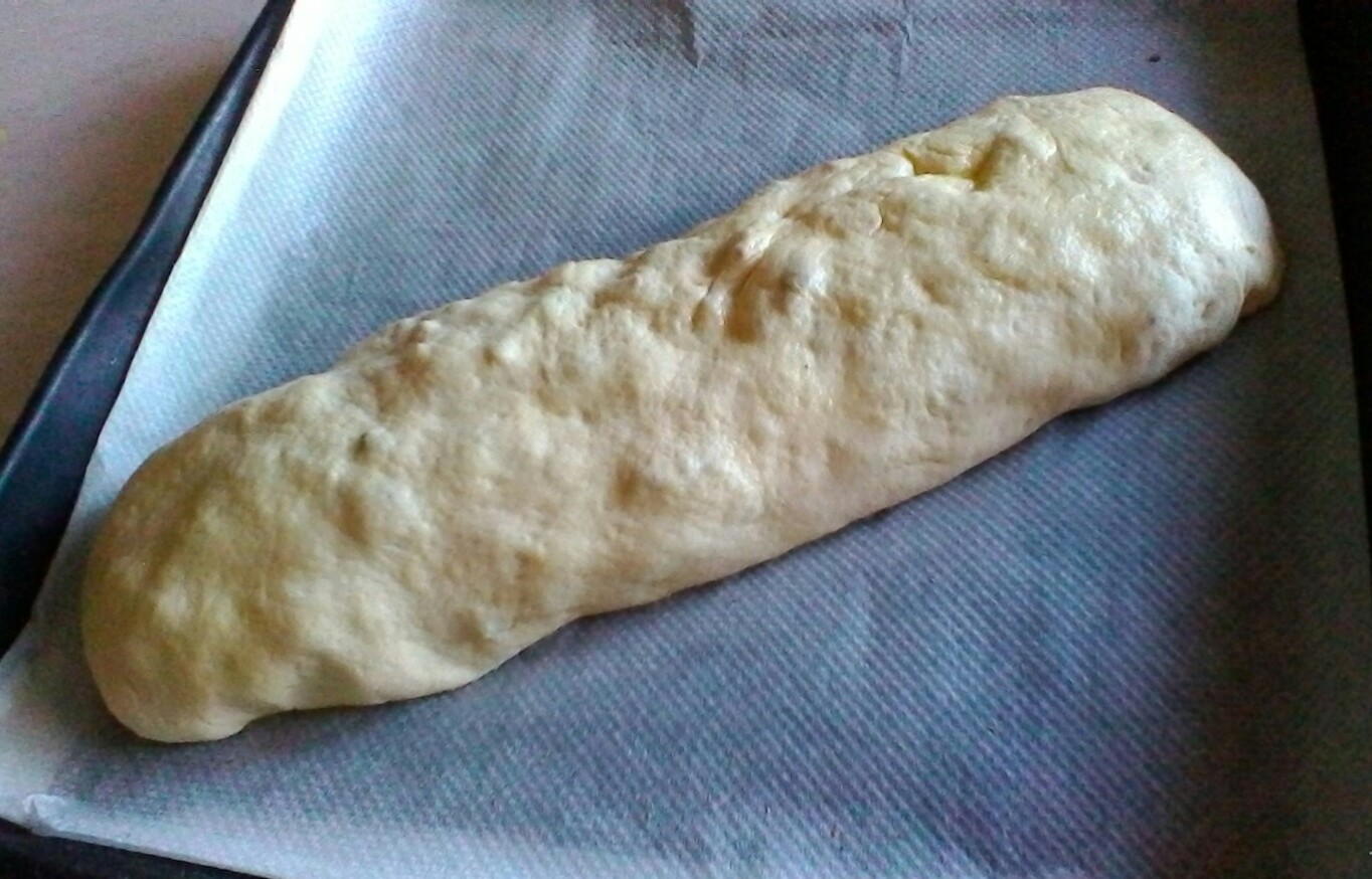 Infarinate il piano di lavoro e stendete l’impasto lievitato. Con il mattarello stendetelo in una sfoglia rettangolare e farcitelo con il ripieno di broccoli e salsiccia e della scamorza. Arrotolatelo nel senso della lunghezza, chiudete bene le estremità e mettetelo in una teglia ricoperta con carta forno.