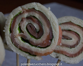 Appoggiare un fetta di pancarrè su un foglio di pellicola poi schiacciarla con l’aiuto di un mattarello e allargarla un pochino (non esagerare il pane non deve diventare fino come un foglio). Spalmare il pane con un leggero strato di maionese (o altra crema salata a piacere, va benissimo quella dei tramezzini precedenti ma invece di aromatizzarla con il cren è preferibile usare delle erbe aromatiche) poi appoggiarvi uno strado di insalatina e sopra le fette di salmone. Con l’aiuto della pellicola arrotolare il pane il più strettamente possibile in modo da ottenere un piccolo cilindro, poi chiuderlo sigillandolo bene con la pellicola e conservarlo in frigo. Poco prima di servire tagliarlo a fettine e infilarle negli stecchini.