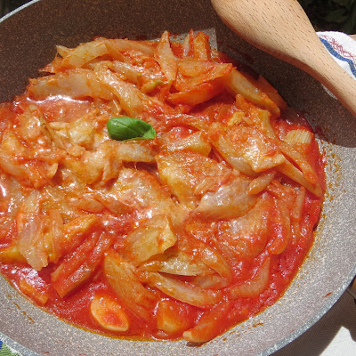 Fate soffriggere a fuoco lento la cipolla e lo spicchio di aglio, fino a che la cipolla non sia traslucida, quindi unite la passata di pomodoro, le foglioline di basilico, salate, unite una puntina zucchero per rendere il sugo meno acido e una spolverata di pepe bianco, per finire alcuni cucchiai di acqua in modo che il sugo si possa ben amalgamare, mescolate bene, alzate leggermente la fiamma, mettete il coperchio e tenete mescolato ogni tanto.