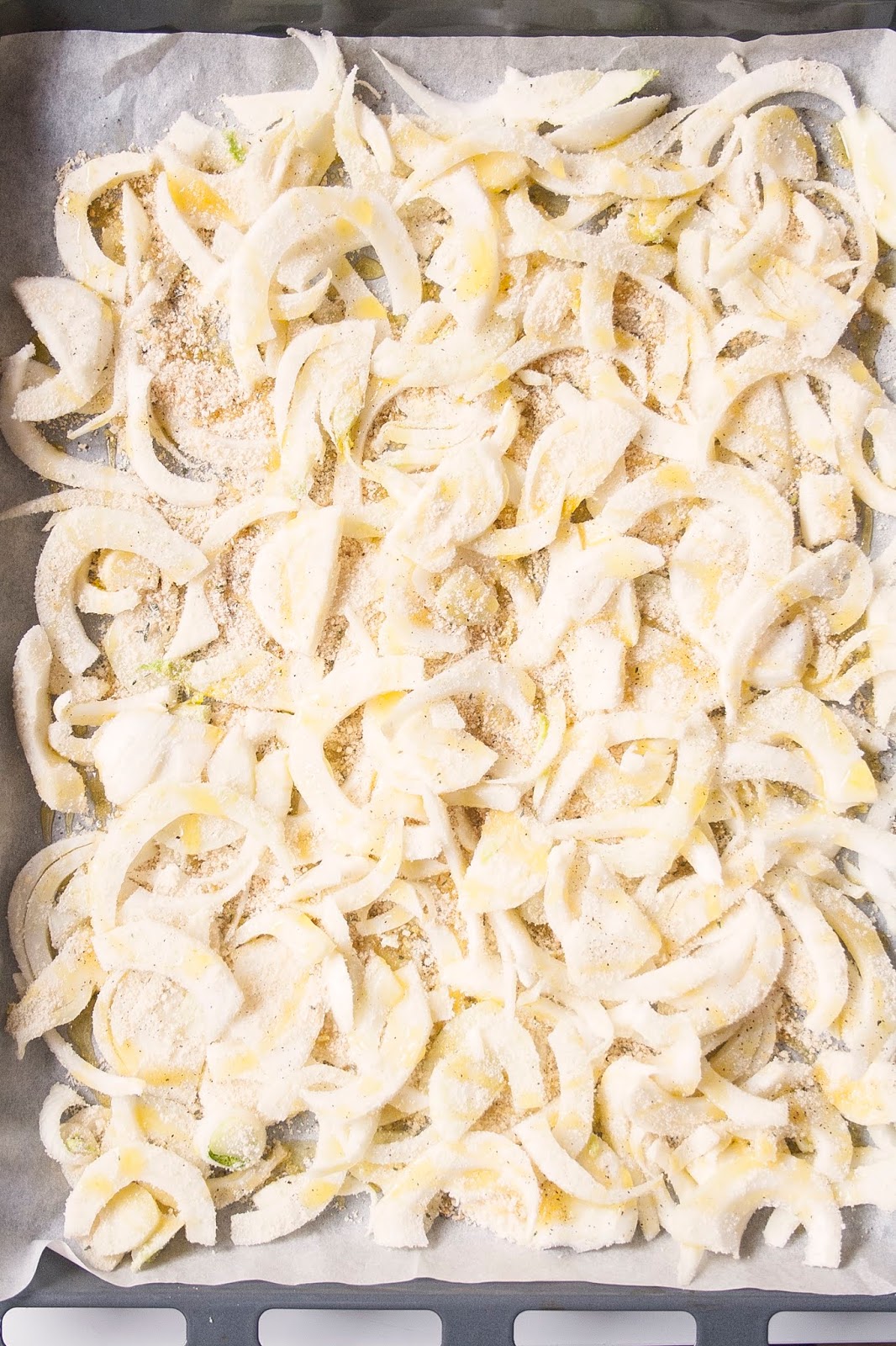 Trasferite i finocchi impanati sopra la leccarda rivestita di carta forno e irrorate con l’olio extravergine di oliva.