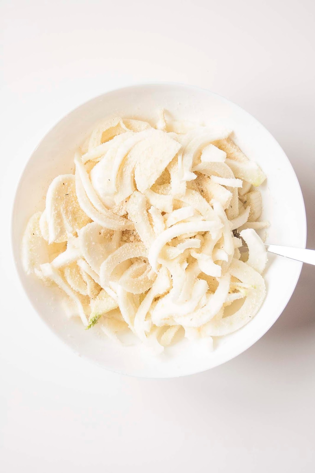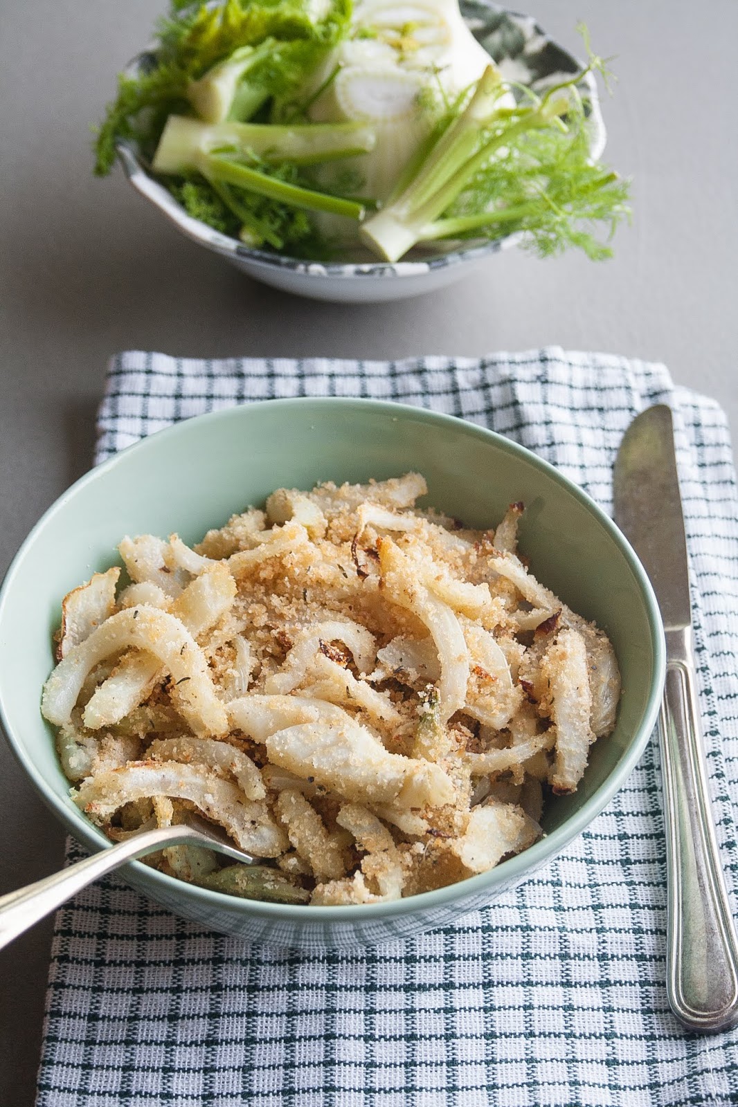A seguire mettete in una ciotola il pangrattato con il Parmigiano, le foglioline di timo, un pizzico di sale e pepe, mescolate il tutto e poi unite le fettine di finocchio.
