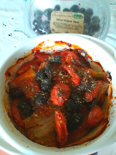 ed alternare strati di finocchio,cipolla,olive pomodori,sale , peproncino e origano,fino ad esaurire