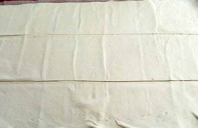 Stendere la pasta sfoglia e tagliarla in tre rettangoli uguali.