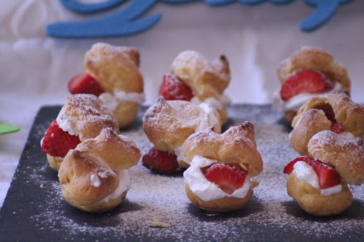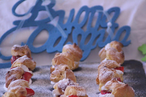 in ogni metà di bignola spruzzare un bel ciuffo di panna