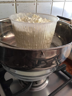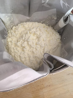 trasferire i fiocchi di latte in contenitore di scolo (io ho utilizzato una fascetta per fare la ricotta, ma va bene anche un colino a maglie strette).
