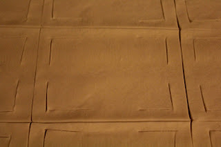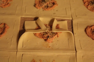 Ad 1 cm di distanza dal bordo, incidere la sfoglia a L nell’angolo di ogni quadrato, come mostrato nella fotografia.