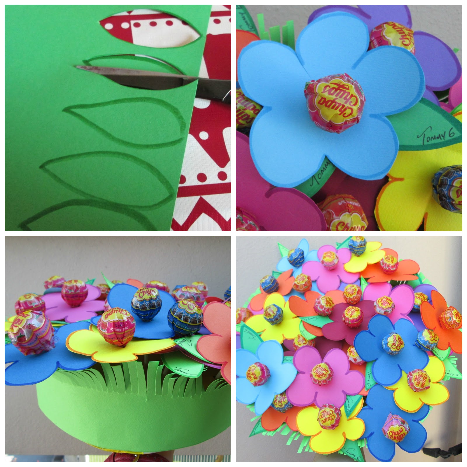 - componete ora i vostri fiori infilando i lecca lecca nel cartoncino a forma di fiore e inseritevi poi anche la fogliolina sotto