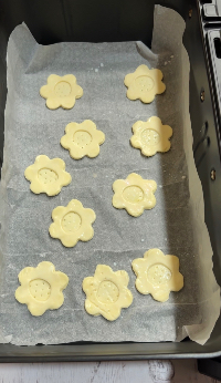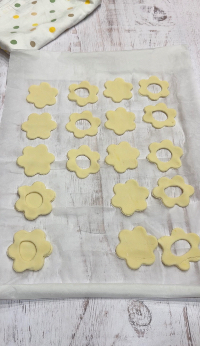 Ora componi i fiori sovrapponendo quelli forati sopra quelli interi, facendo aderire bene i bordi. Spennella delicatamente la superficie con un po’ di latte, quindi bucherella la base con i rebbi di una forchetta per evitare che gonfi eccessivamente durante la cottura.
