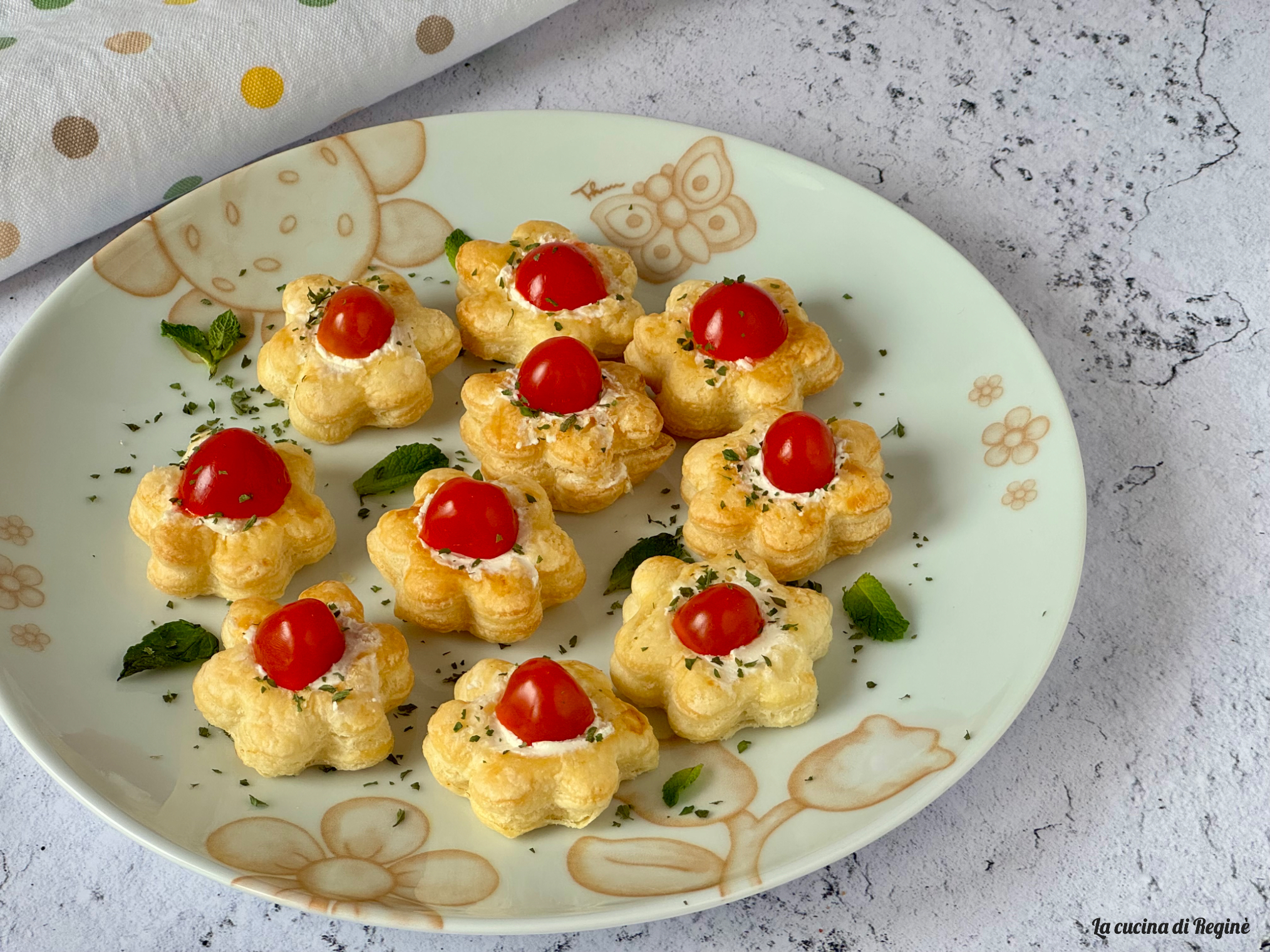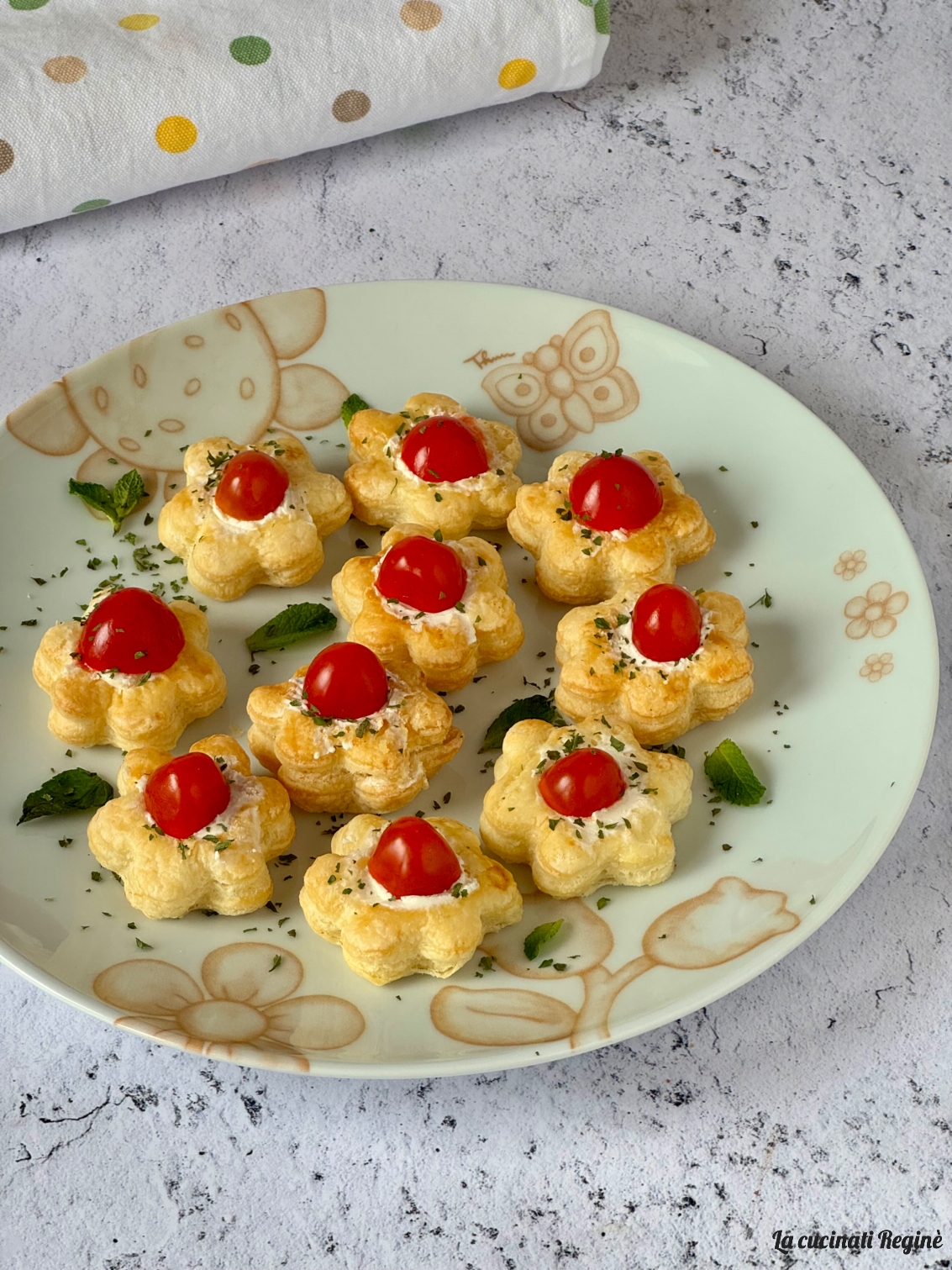 Infine, servi i fiori di sfoglia completando con una spolverata di prezzemolo secco tritato e qualche fogliolina di menta fresca, per aggiungere un tocco aromatico e ancora più primaverile alla preparazione.