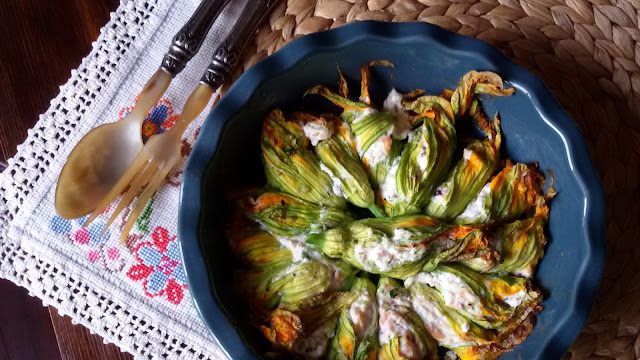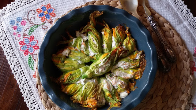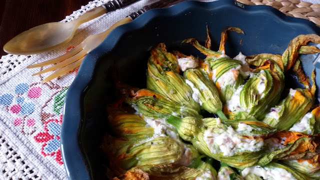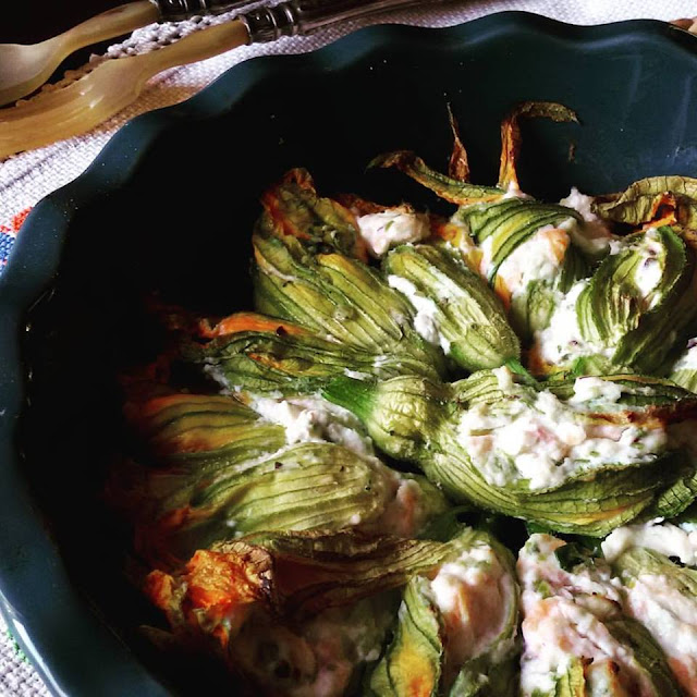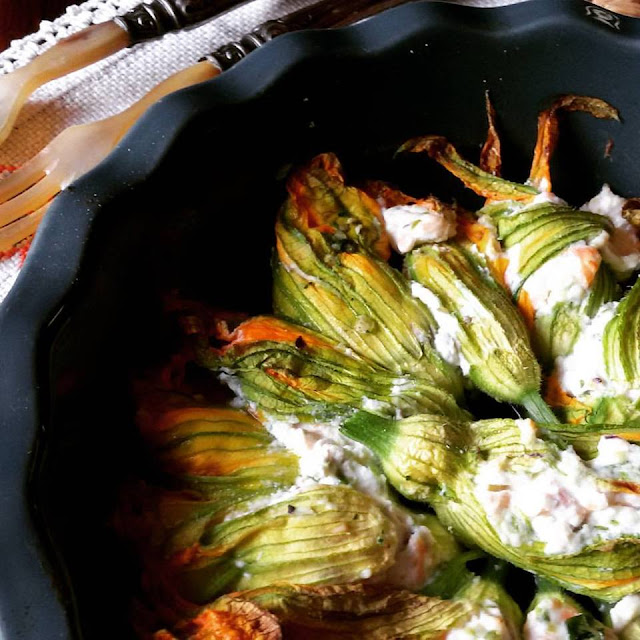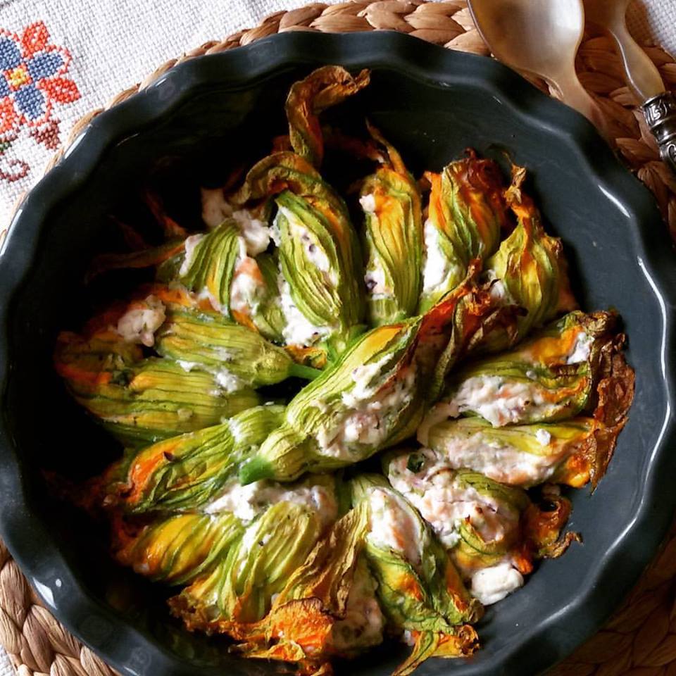 E le ricette con i Fiori di Zucca continuano. Dopo averli riempiti con la carne e averli messi in quella Splendida Torta Salata ai Sapori Toscani qualche settimana fà, averci condito gli Gnocchi insieme alla Bresaola e averci fatto una Torta di Riso Salata questa volta ho voluto provare a farli un po’ fuori dal comune: Ripieni di Salmone, Ricotta e granella di Pistacchi.