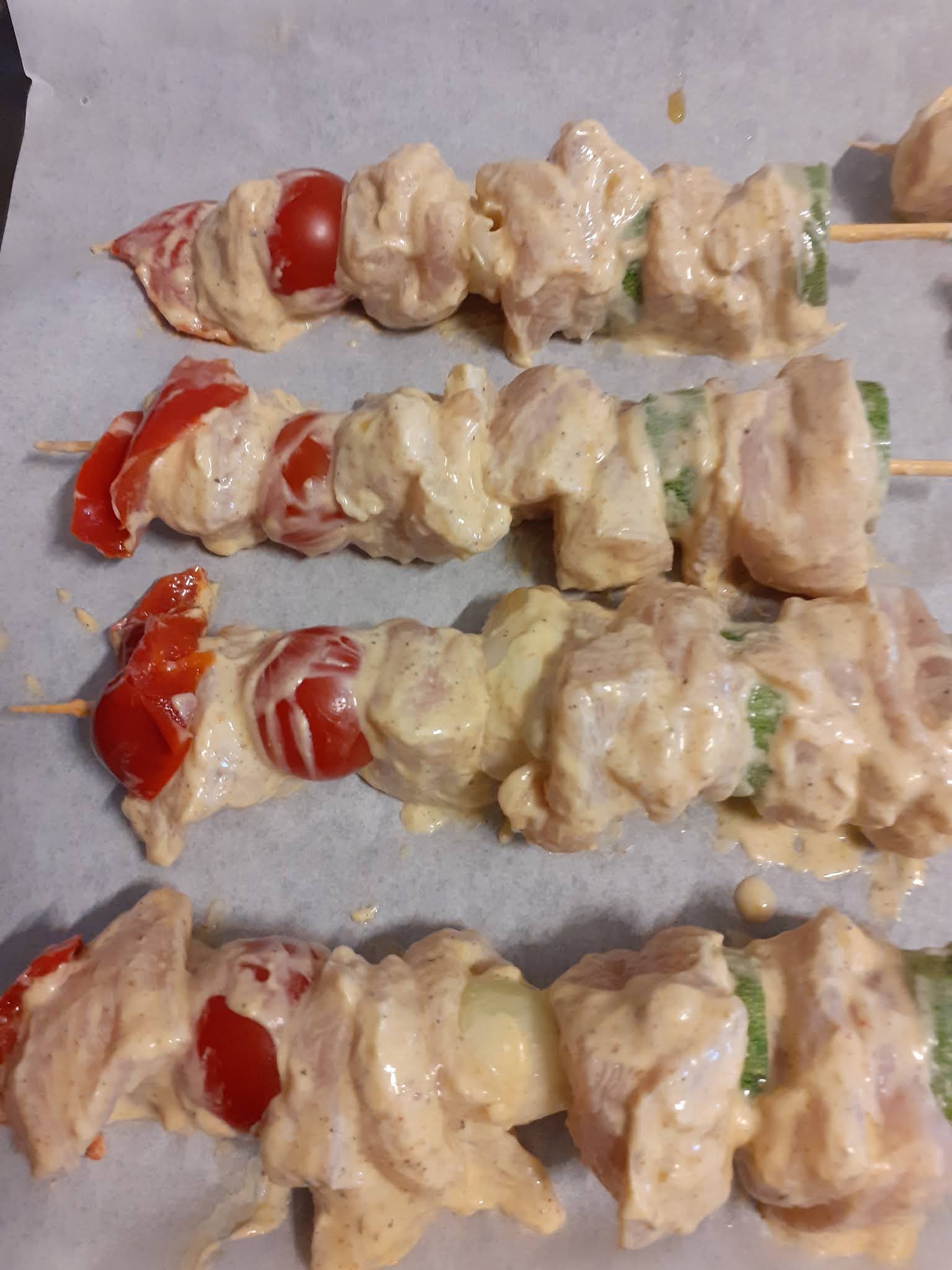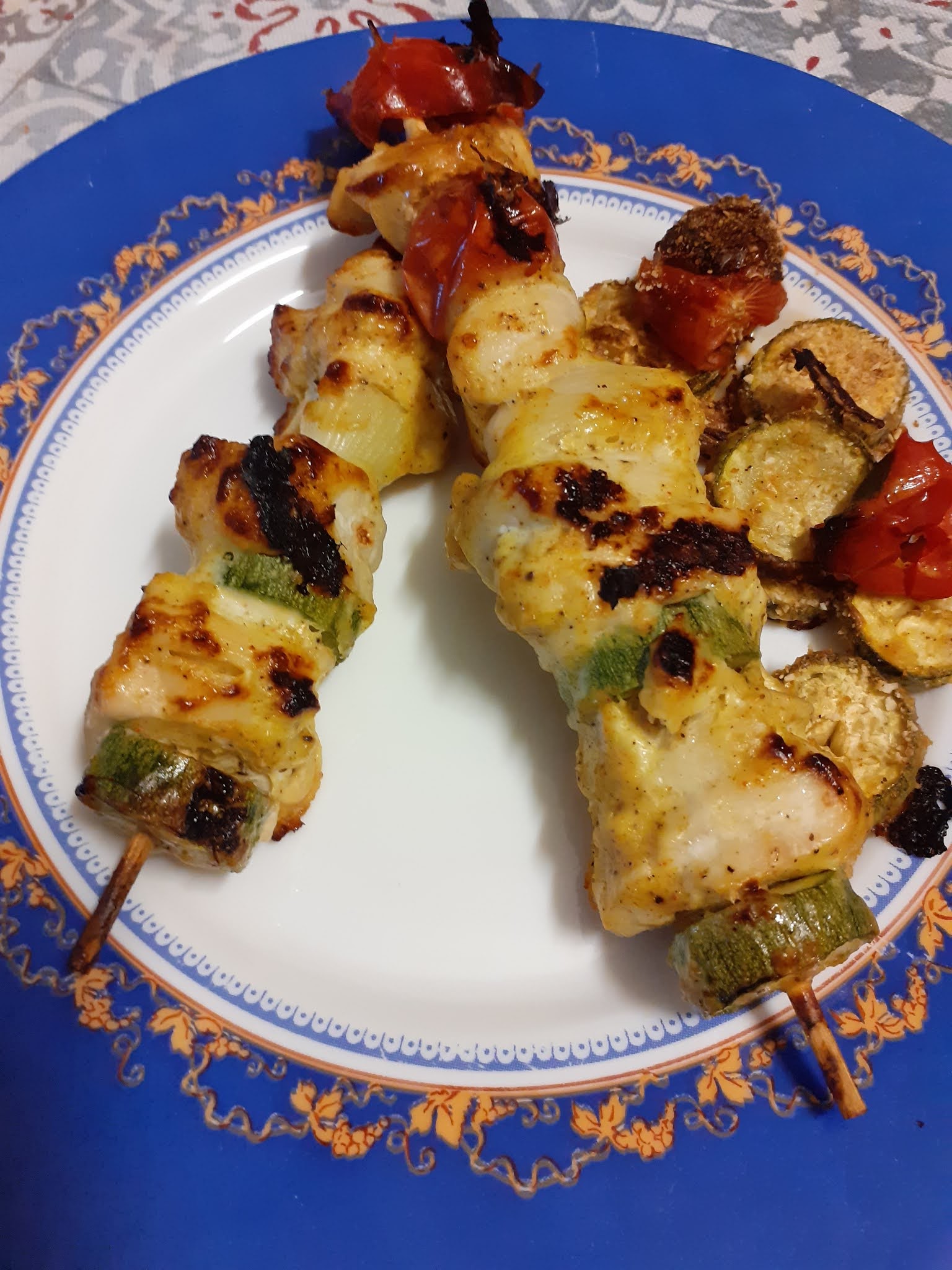 Riprendiamo il pollo e iniziamo a montare gli spiedini alternando al pollo i vari pezzi di peperone,zucchina o cipollotto!.Terminato il tutto li adagiamo in una teglia con carta forno e li cuociamo a 200° fino a cottura..(cca 20′)