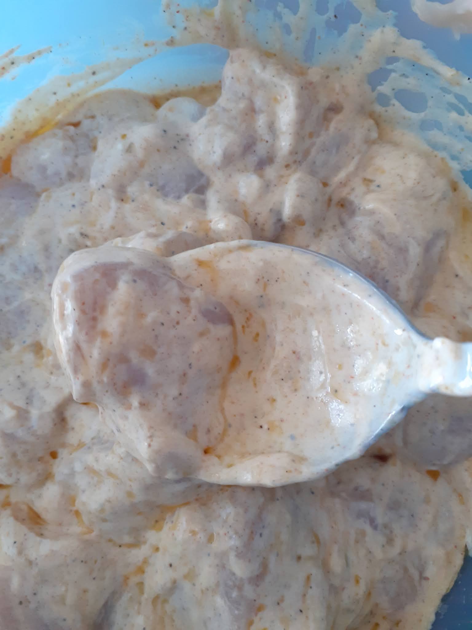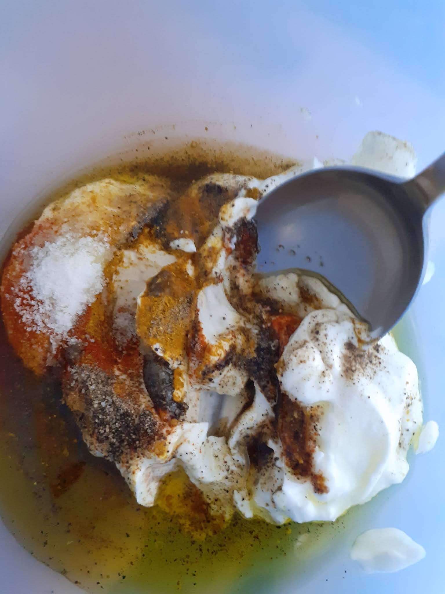 Iniziamo col tagliare il pollo a dadini (non piccoli),li metteremo in una ciotola con yogurt,olio e tutte le spezie,