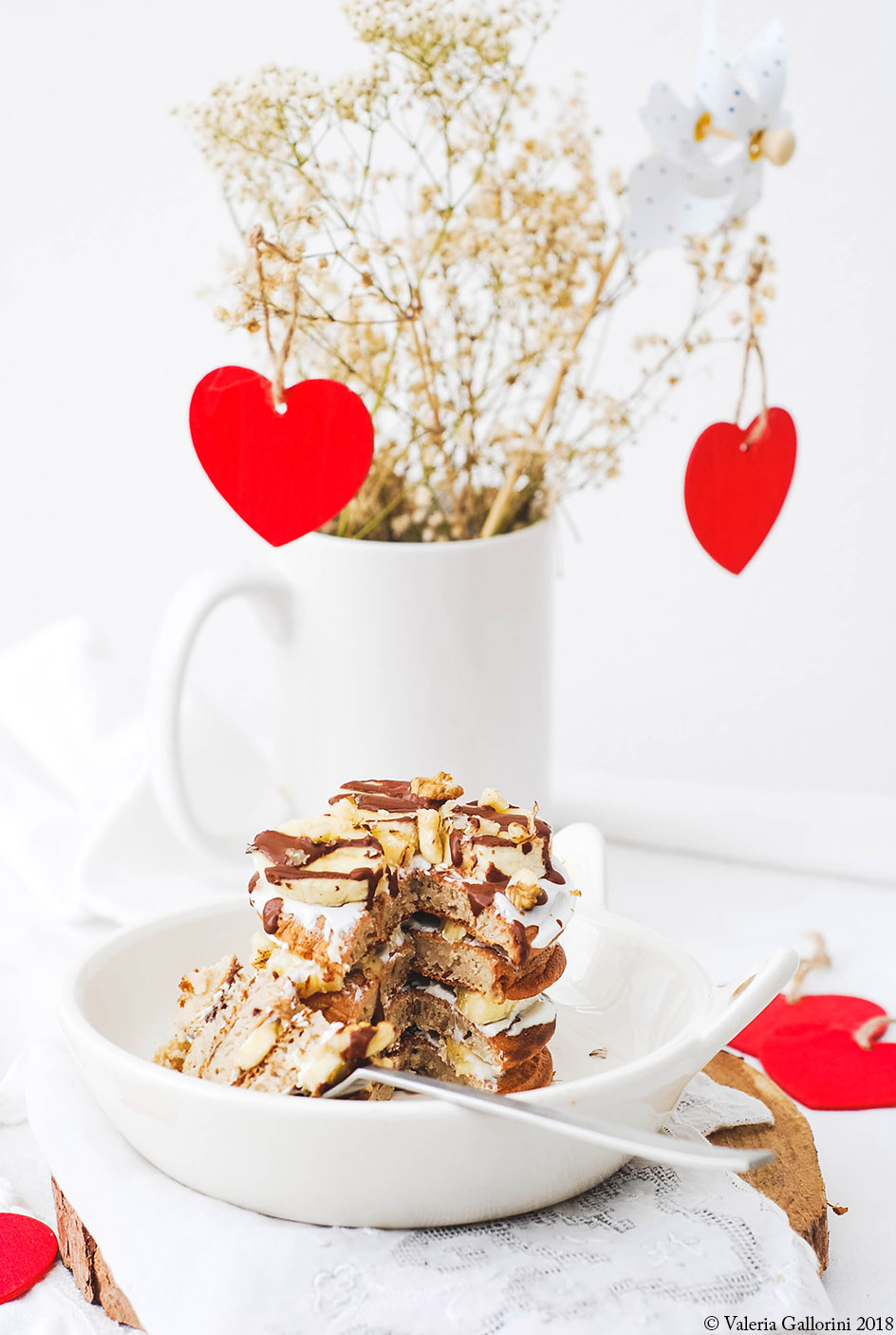 Quando avrete finito di cuocere tutto l’impasto, procedete a comporre la torretta, spalmando ogni pancakes con lo yogurt greco e mettendo 4 fettine di banana. Continuate così fino all’ultimo che guarnirete allo stesso modo con l’aggiunta di noci tritate e una salsa fatta semplicemente con cacao amaro in polvere e acqua (e dolcificante a piacere).
