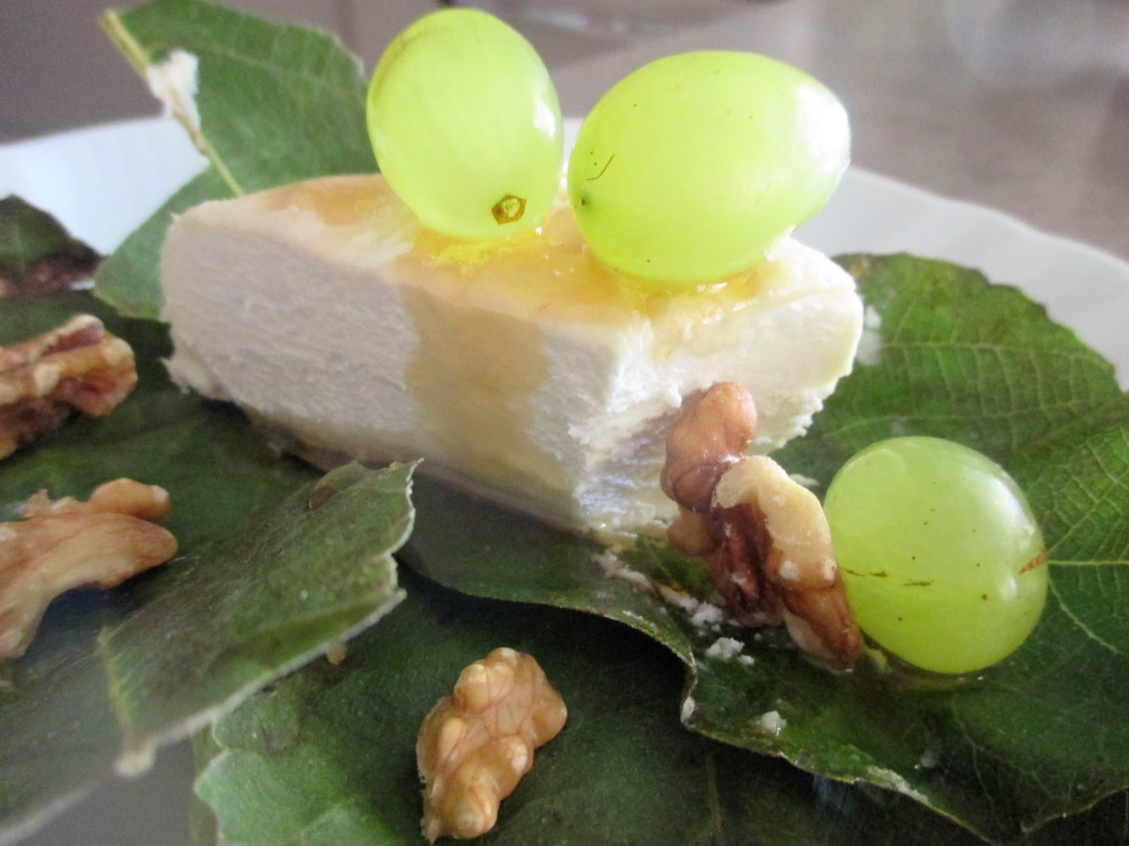 Passing through the stalls of the market of a country nearby, I came across a nice bench for a manufacturer of artisan cheeses and noticed a creamy but fairly consistent goat cheese wrapped in fig leaves. Its very peculiar smell convinced me to buy it and take it home where I prepared a small appetizer that has cheered my day. Goat cheese, chestnut honey (the right bitter sweet that goes counter to the strong flavor of the cheese), walnuts and grape freshness to lighten the whole. If you have time, try it.