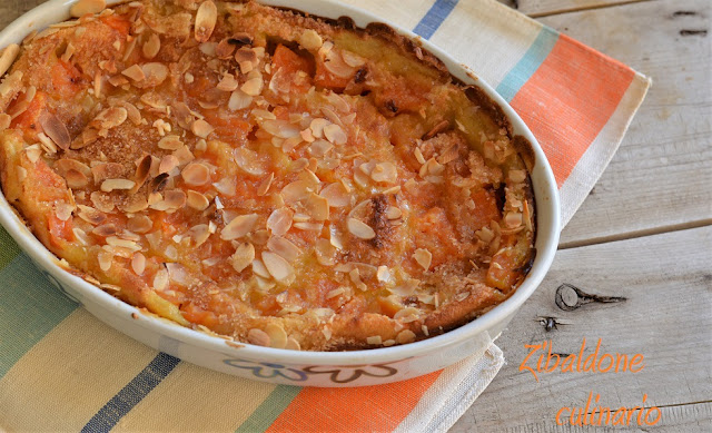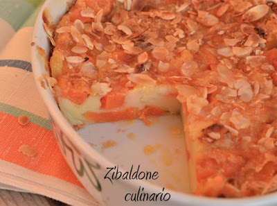 Cuocere in forno caldo per 20 minuti, quando la superficie risulta compatta, toglierlo e cospargerlo di mandorle a lamelle e zucchero di canna. Proseguire la cottura, accendendo anche il grill per ancora 20 minuti.