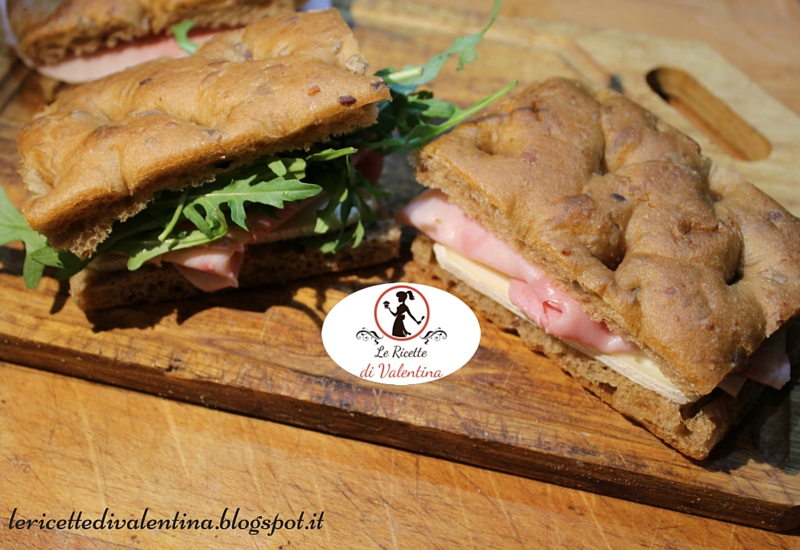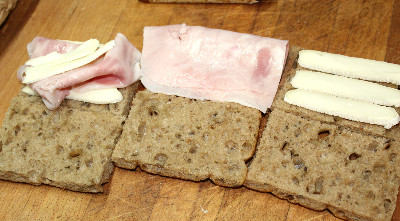 Sistemate sulle metà inferiori delle focacce del formaggio, poi la fetta di prosciutto e poi ancora formaggio e richiudete il panino.