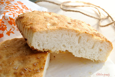 Questa meravigliosa focaccia non è farina del mio sacco, ma di Simona Fiori: autrice di ricette senza glutine per La Cucina del Corriere della Sera e del blog Noglu’s Kitchen nonché persona dolcissima e sempre disponibile.