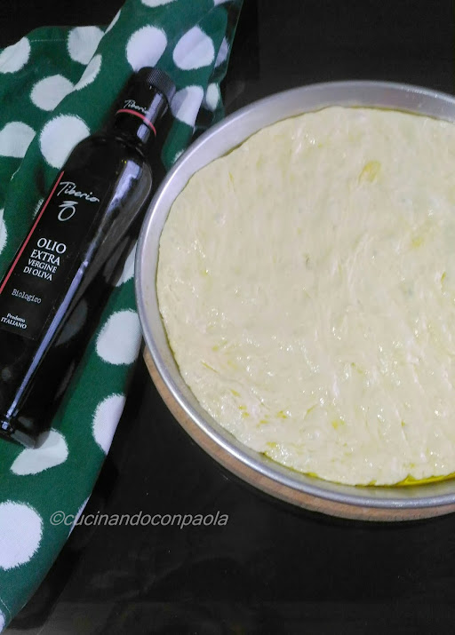 distribuite 3-4 cucchiai d’olio (abbondanti) su tutta la superficie della focaccia