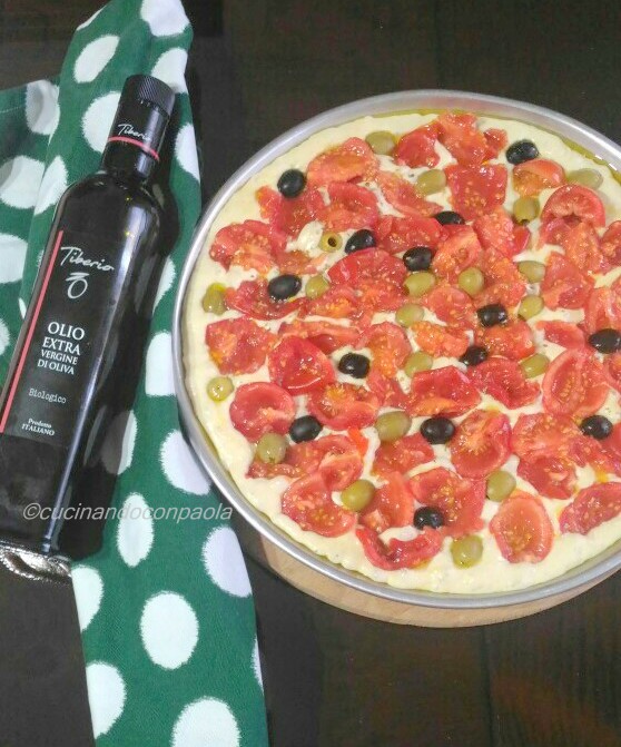 Stendete la focaccia (in teglia) e distribuite i pomodorini Piccadilly