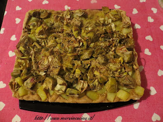 In una scodella unire lievito, farina e sale ed aggiungere un bicchiere d’acqua, impastare bene e stendere su una teglia con cartaforno. Sbucciare e tagliare a cubetti le patate e cuocerle per 10 minuti coperte d’acqua, eliminare l’acqua di cottura e distribuire le patate sulla focaccia. Cuocere in forno a 190° per 15 minuti. Nel frattempo tagliare i carciofi eliminando le parti più dure e tagliarle in spicchietti, coprirle di acqua e succo di un limone e dopo mezz’ora scottarli con tutta l’acqua e limone, quando bolle l’acqua spegnere il fuoco. Distribuire anche i carciofi sulla focaccia e infornare per altri 10 minuti. Aggiungere un filo d’olio ed una manciata di gomasio.