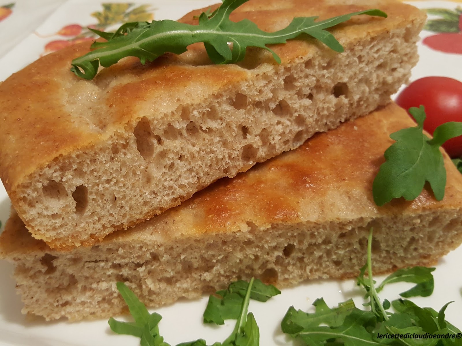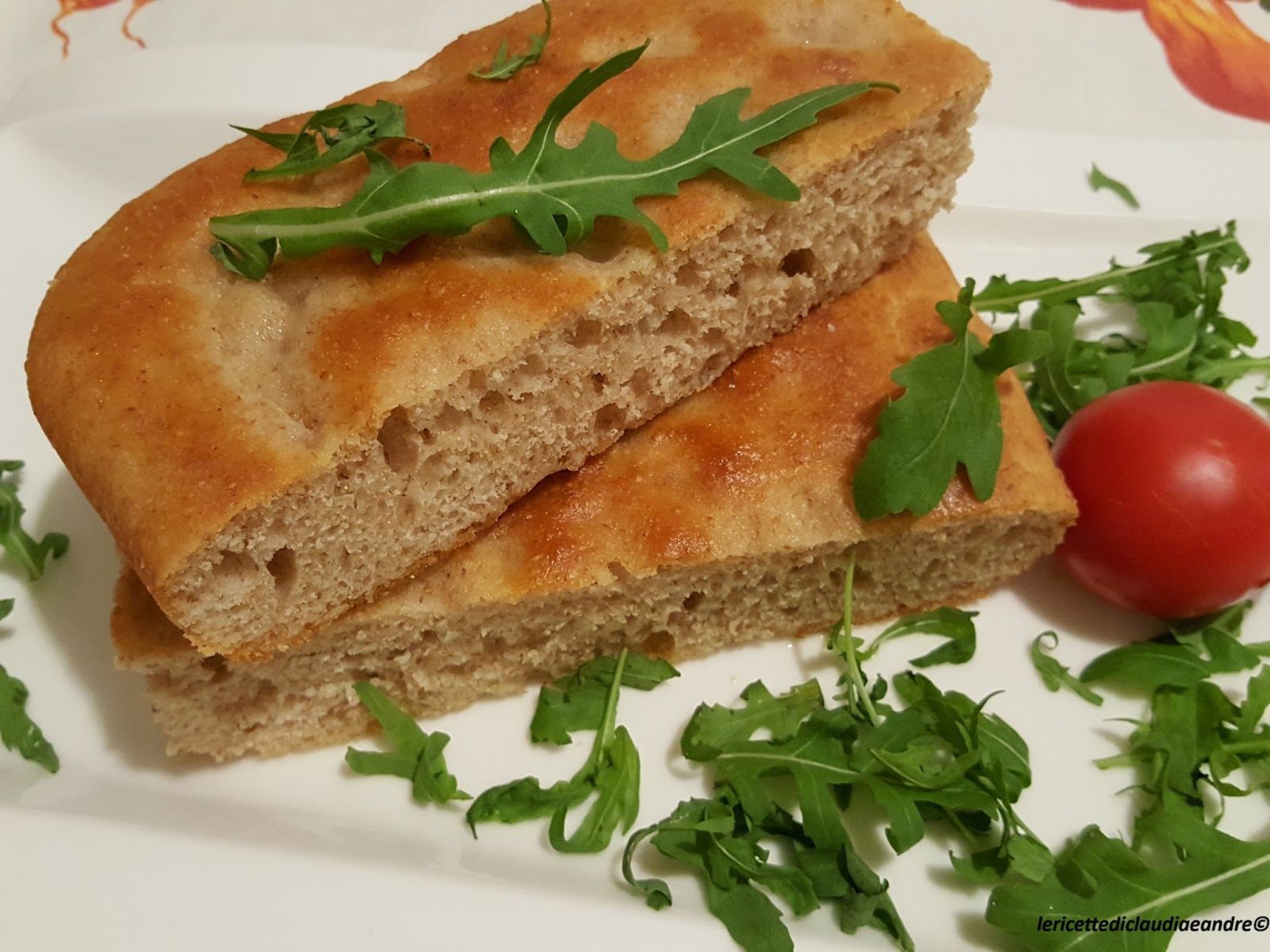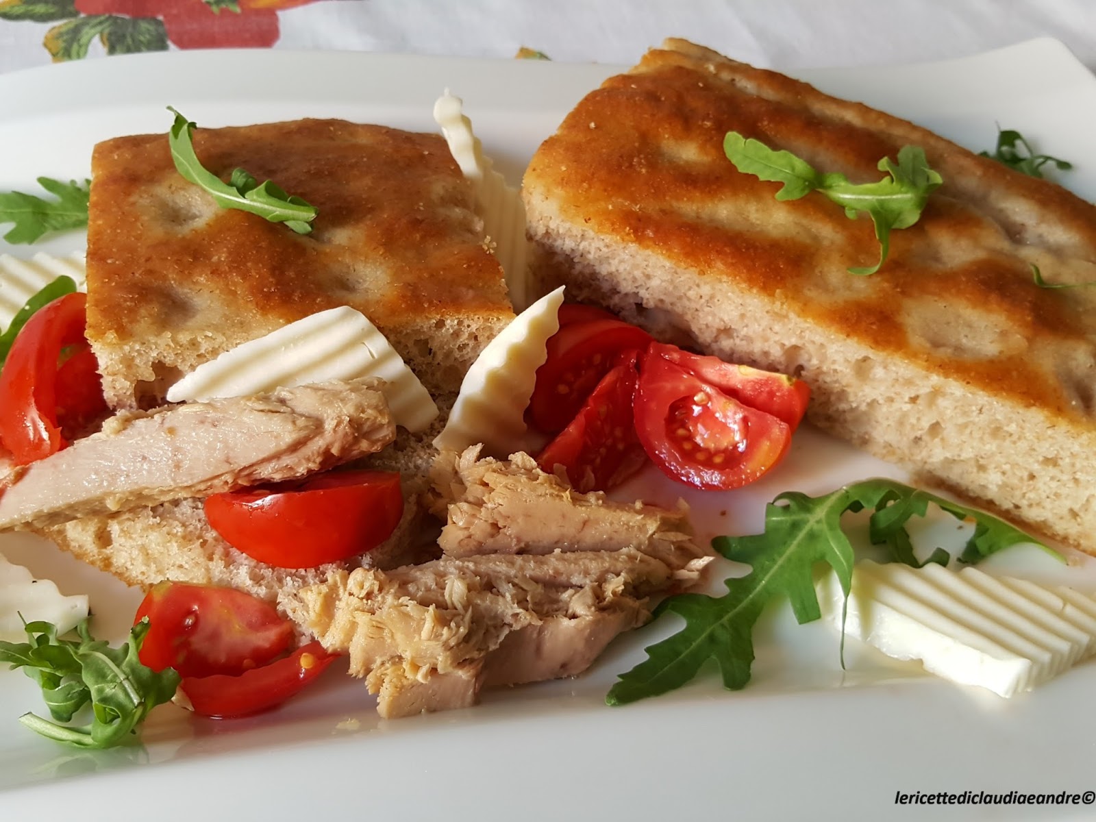 Focaccia con farina semintegrale, farina di ceci, tonno, rucola, formaggio e pomodorini