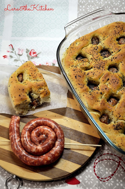 Tagliate la salsiccia a pezzetti grossi, massimo un centimetro, affondateli in modo sparso nella focaccia e spolverate con semi di papavero a piacere.