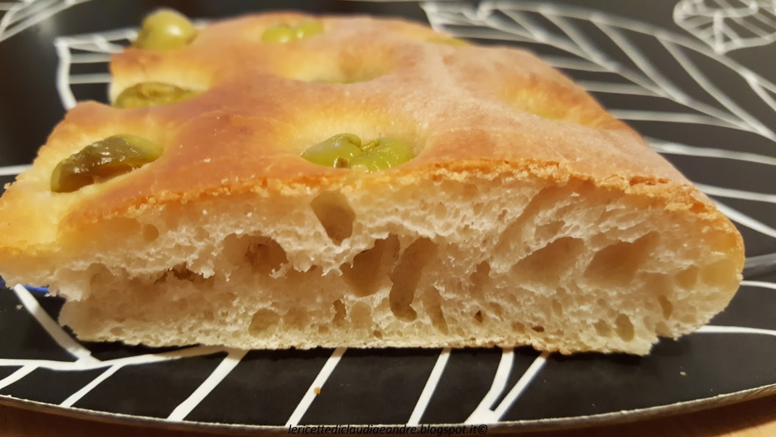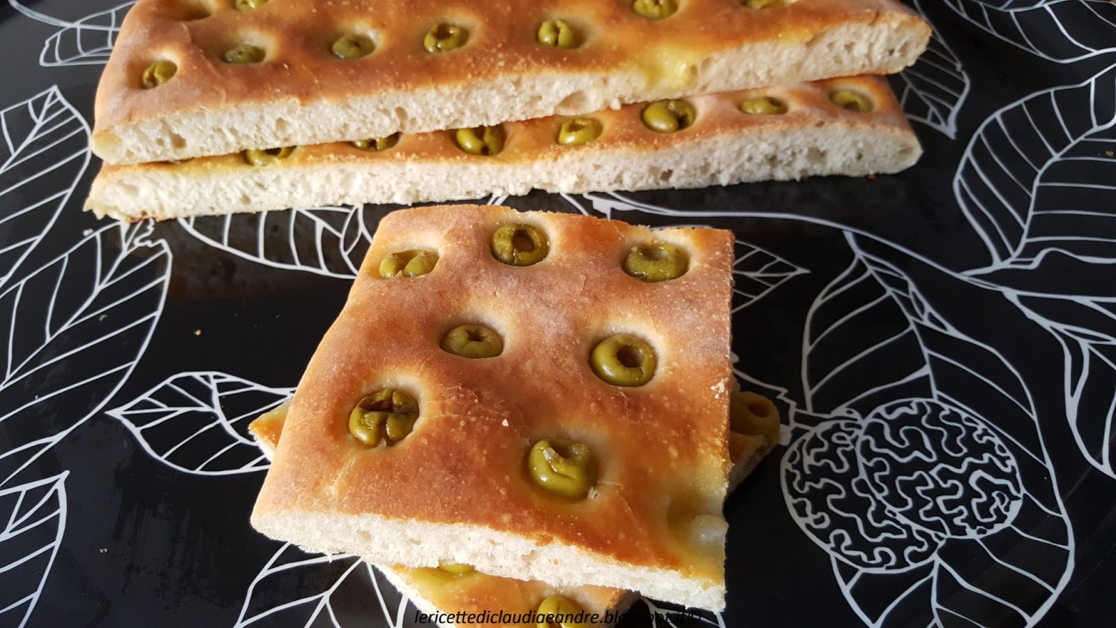Focaccia con semola rimacinata, olive verdi e lievito madre