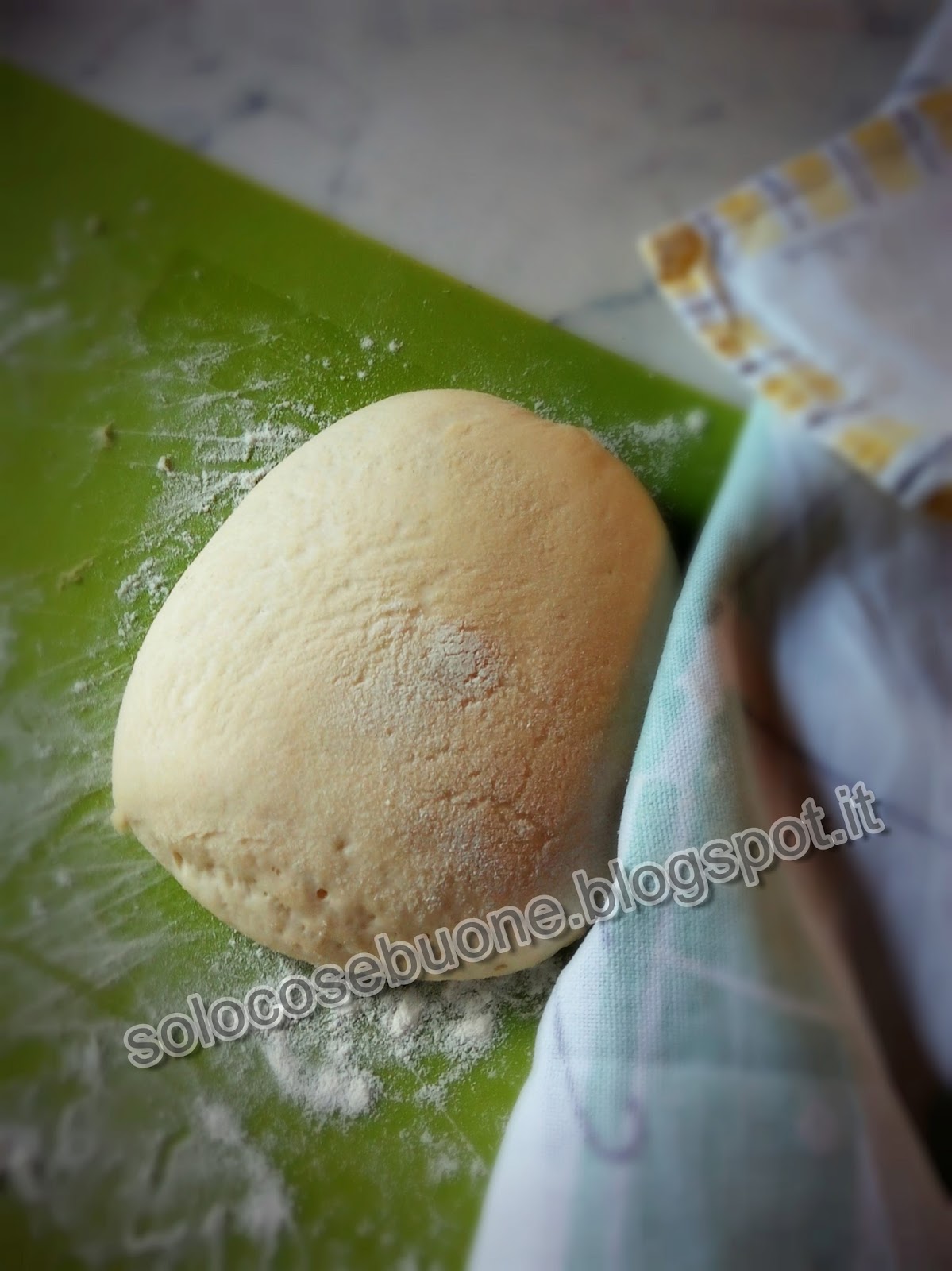 Infariniamo la spianatoia e versiamoci l’impasto. Dopo aver dato un paio di pieghe, dividiamolo in quattro e mettiamo a lievitare per almeno 90 minuti coperto da un canovaccio e da un foglio di pellicola.