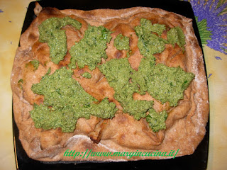 Raccogliere la farina in una ciotola, versarvi al centro l’acqua, l’olio e il sale. Impastare con cura per rendere l’impasto uniforme e liscio, lasciarlo riposare una mezz’oretta. Dividerlo a metà e ricavare con il matterello due sfoglie sottilissime. Sdraiare su una teglia con carta forno la prima sfoglia e distribuirvi la formaggetta di mandorla (per la ricetta clicca qui) su tutta la superficie. Ricoprire con la seconda sfoglia e far aderire bene i bordi. Tagliare la sfoglia superiore con un coltello per farne uscire l’umidità in cottura ed evitare che “cresca”. Versarvi un filo d’olio. Infornare a 220° per 20 minuti. Frullare gli ingredienti per il pesto e versarlo sulla focaccia.