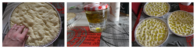 Accendete il forno a 200°, rimuovete la pellicola trasparente dalle teglie e schiacciate leggermente la superficie con le dita dal modo da creare delle fossette nella pasta.