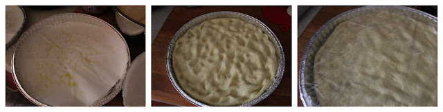 In ogni teglia mettete una palla di impasto è allargata la con le dita fino a riempirla tutta in modo uniforme. Avvolgete ogni teglia con la pellicola trasparente e lasciate lievitare ancora un’ora.