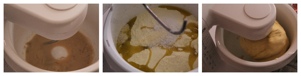 Lavorate l’impasto per circa 3 minuti in modo da tirare fuori il glutine, sarà pronto quando rimarrà attaccato al gancio in un unico agglomerato.