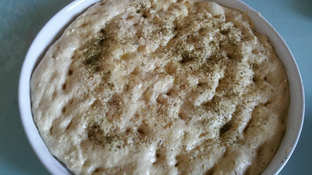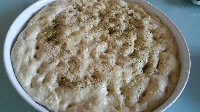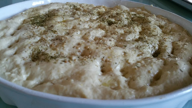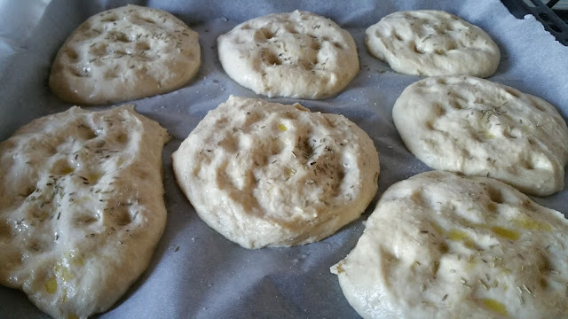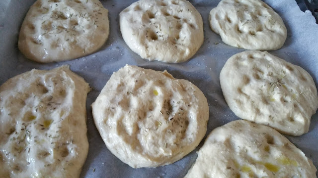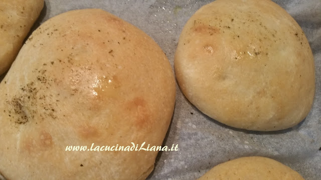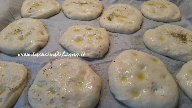 Schiacciare con le dita in più punti le focacce, e spennellarle con una emulsione di acqua e olio, salare e ricoprire di spezie a piacere.
